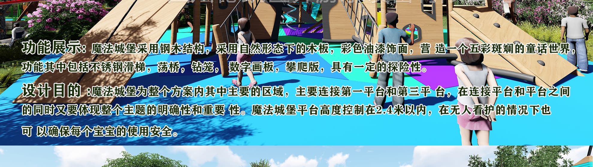 在整個方案的構思上,我們充分考慮到魔幻森林 這一主題,就這一主題思想我們展開了我們的思 維大爆炸,主題設備為魔法城堡和小螞蟻搬家, 在這里可能顛覆了我們的世界觀,充分考慮到安 全和實用性,充分滿足客戶的需求。