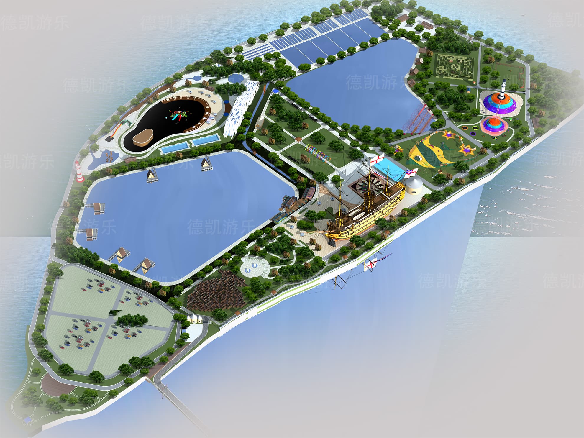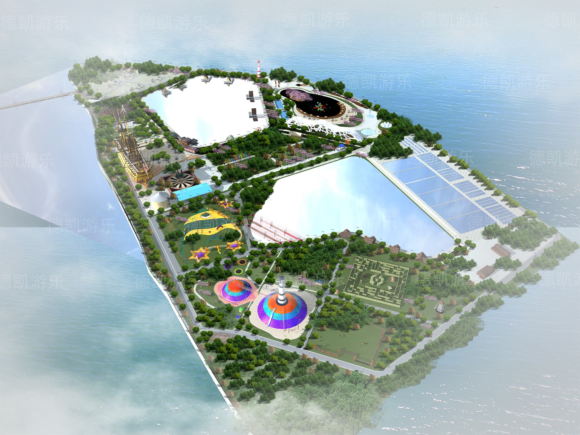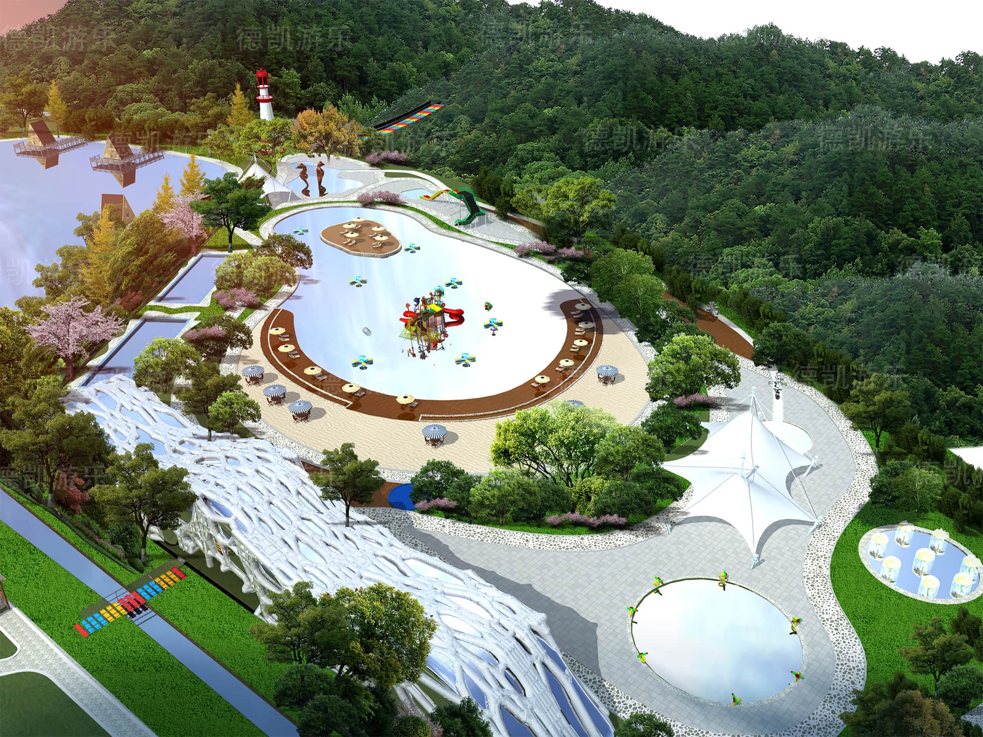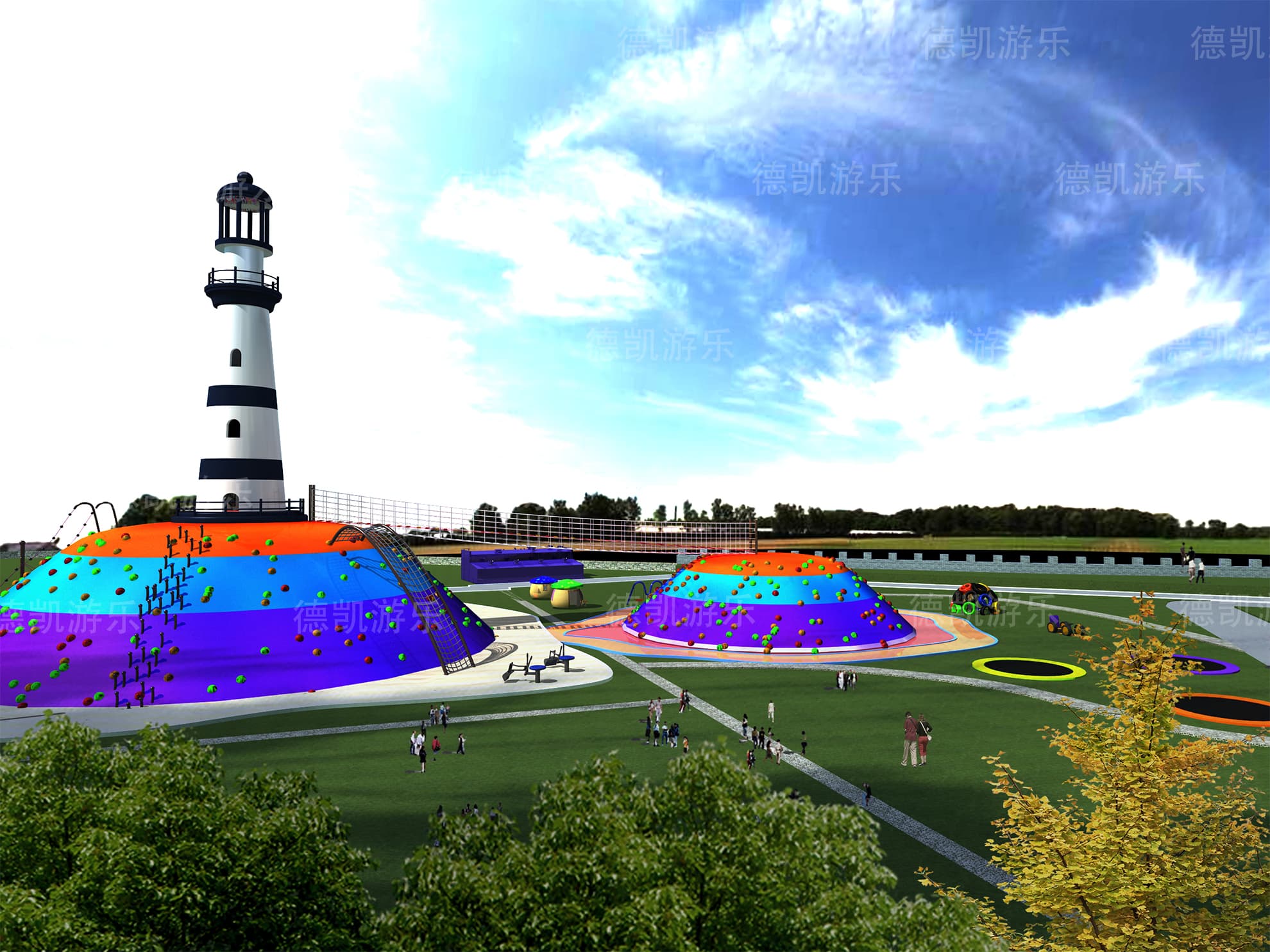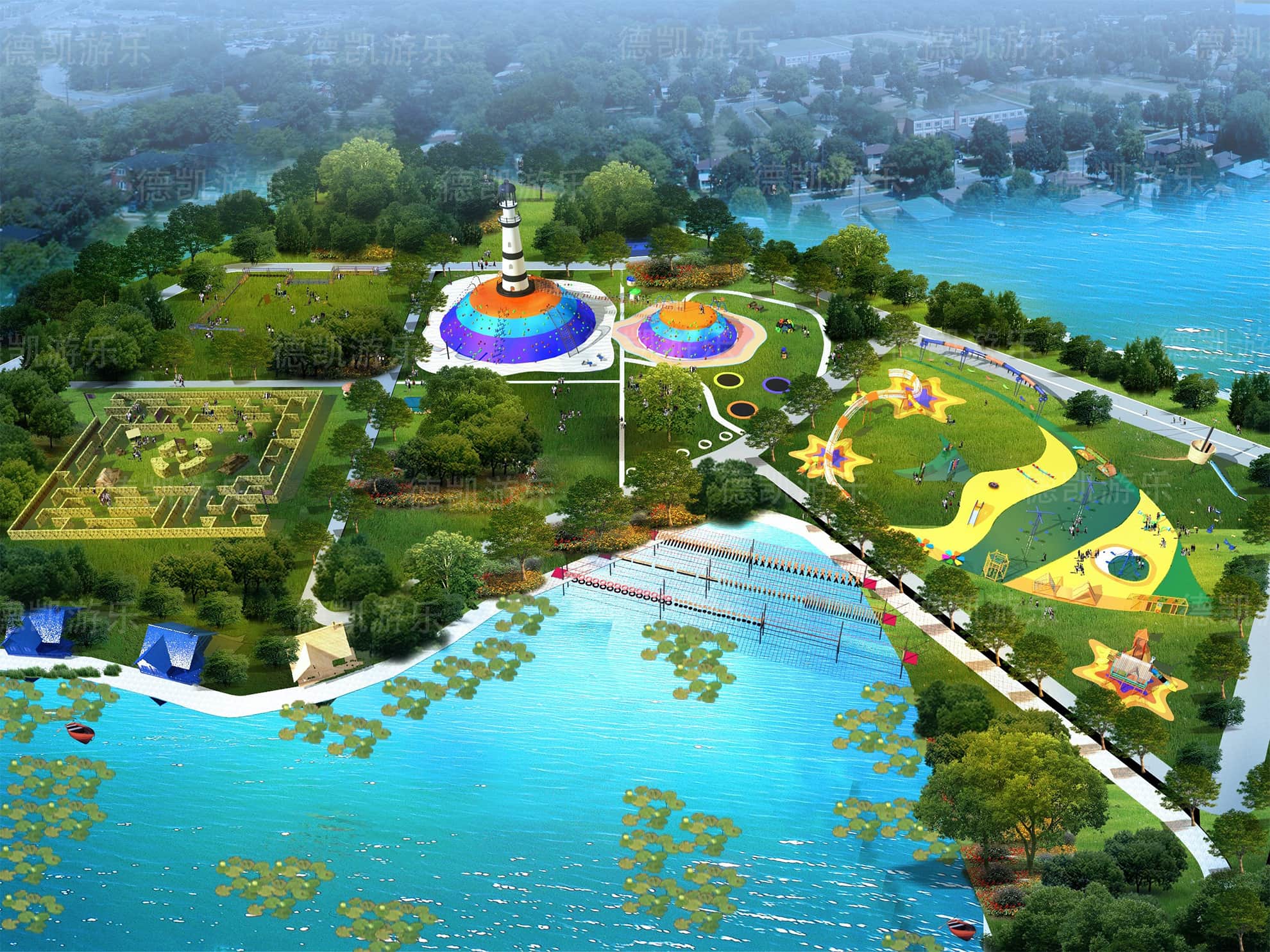 這部分主要呈現的是陸上無動力兒童游樂設備,主要的能看見的有迷宮、燈塔、蹦床、兒童拓展組合、水上蕩橋部分、弧形秋千、爬網木桶組合等。