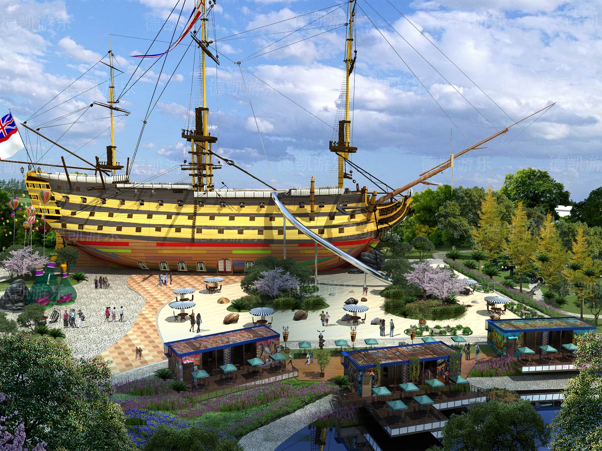 后期的效果圖是已經比較完美的了,不僅是設施設備的完善還是整體規劃細節,景觀性細節幾乎完美的效果圖,客戶可以從效果圖看到建成后的游樂園的整體效果,有利于客戶評估客源定位。