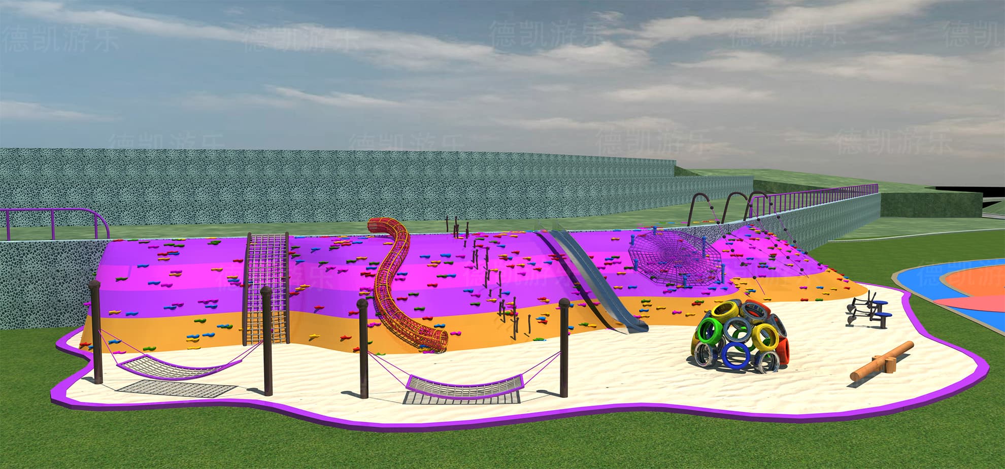 地形游樂區域是相對來說是造價最低,且功能最完善的區域了 ,集合了攀、爬、鉆、滑等功能,且對孩子們很友善,不會存在安全隱患。沙池里面也安置了一些小型的游樂設備,沙池秋千、輪胎組鉆網球、蹺蹺板、挖沙機,給地形游樂區域增加新玩法,增加了區域的游玩性。絢麗的顏色也更加吸引孩子們的眼球,誘惑孩子們來這里探索玩耍。