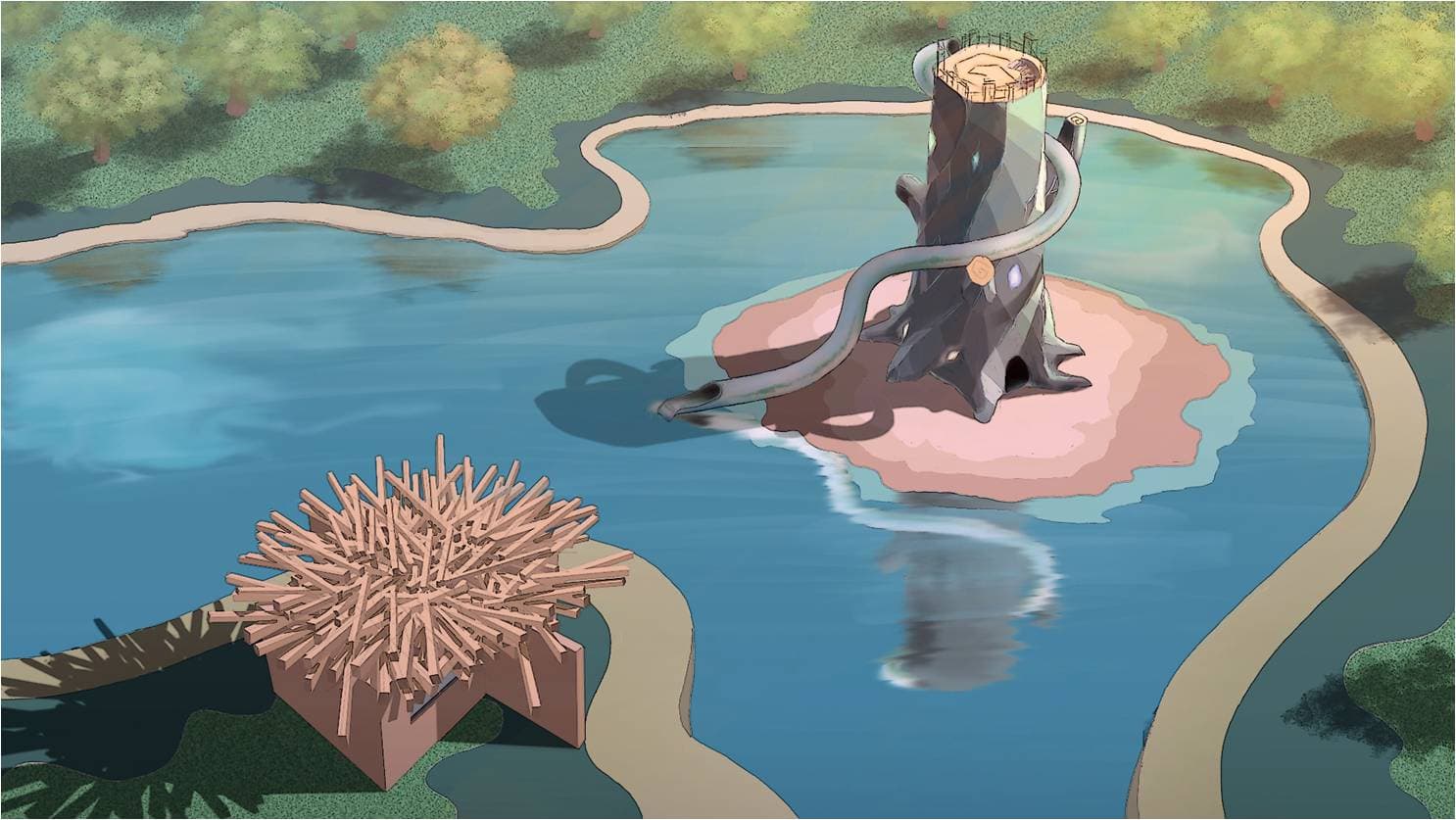 在王國的東北方向,生命之河的中央有一棵象征王國生命的神木。只有得到國王的允許,王國的孩子們才能夠踏上這神圣的頂峰。當你踏上這神圣的頂峰,將會授予鸚鵡勇士的稱號。與之相望的是岸邊巨大的巢穴,這是鸚鵡王國孕育勇士的地方,神樹將給予它庇護。
